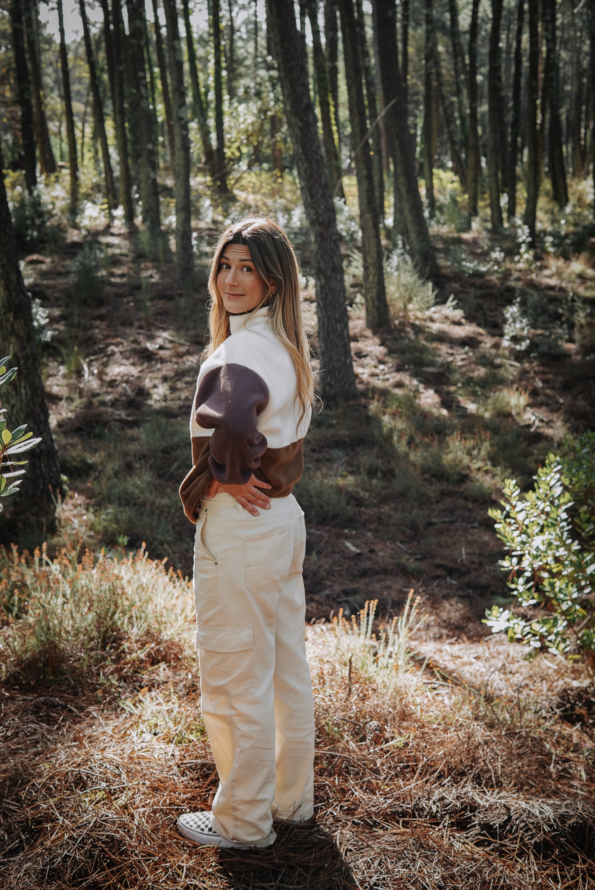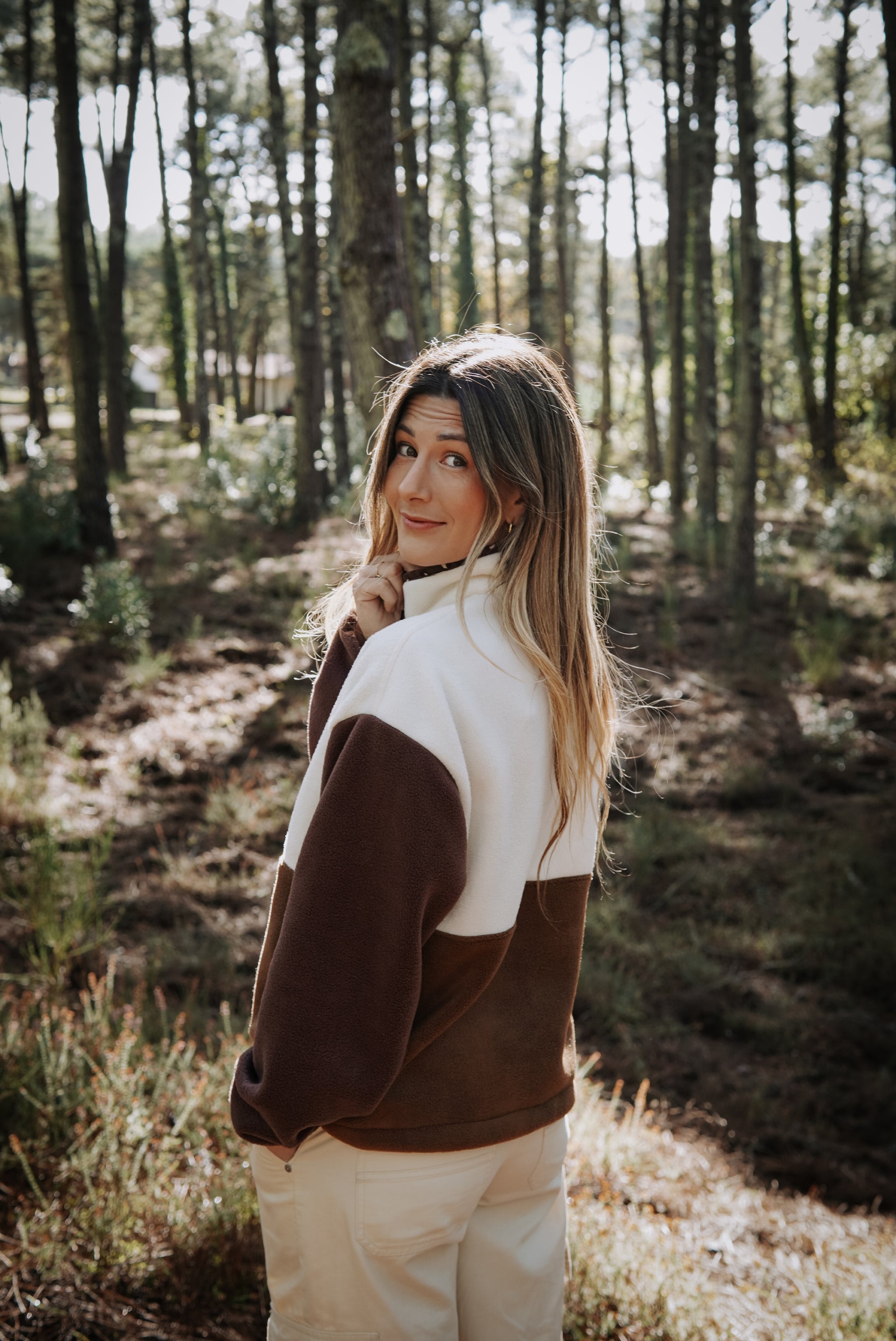 Les contrastes de marron et d’écru rappellent les sentiers d’automne, et sa simplicité en fait une pièce que tu portes tout le temps, sans y penser.