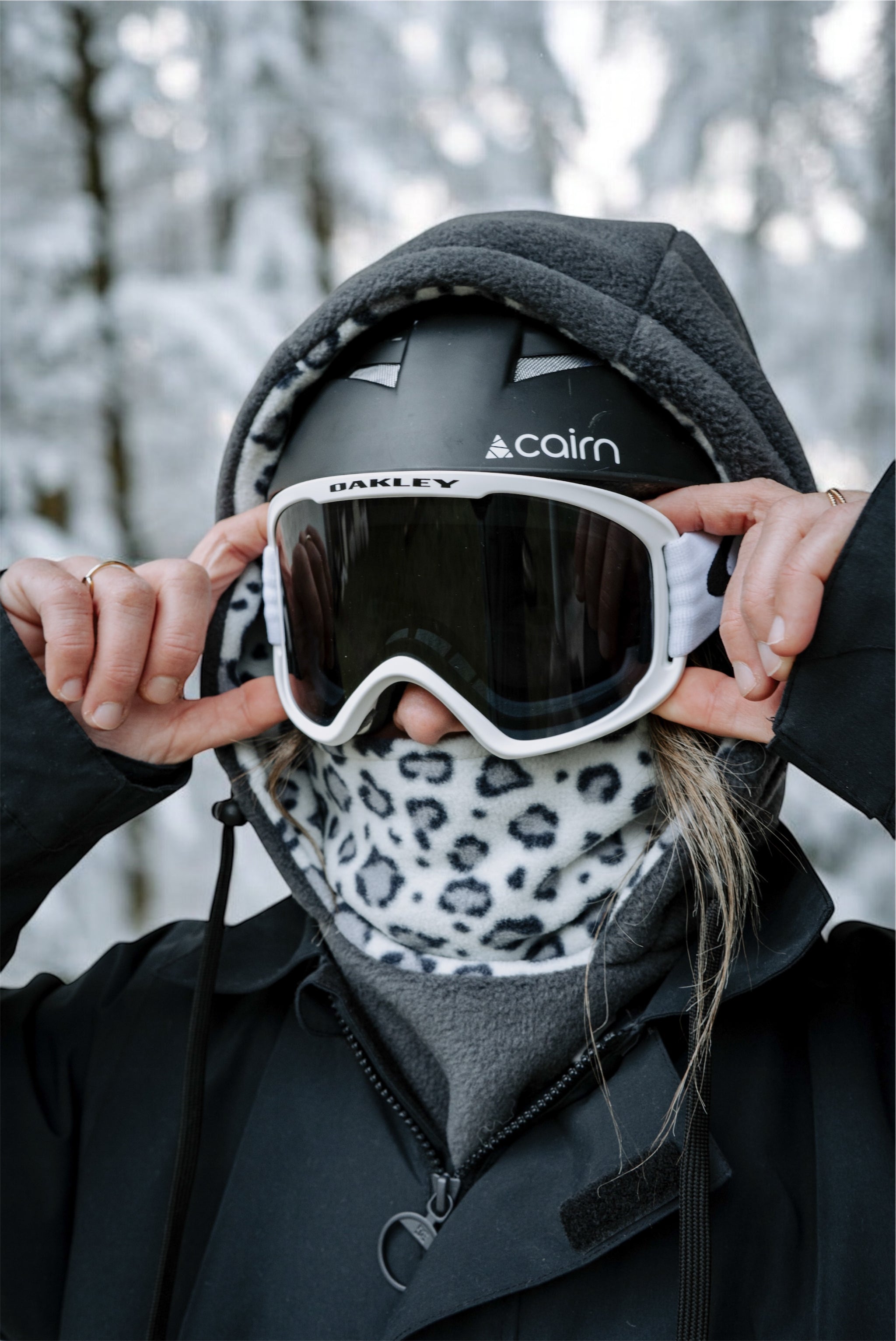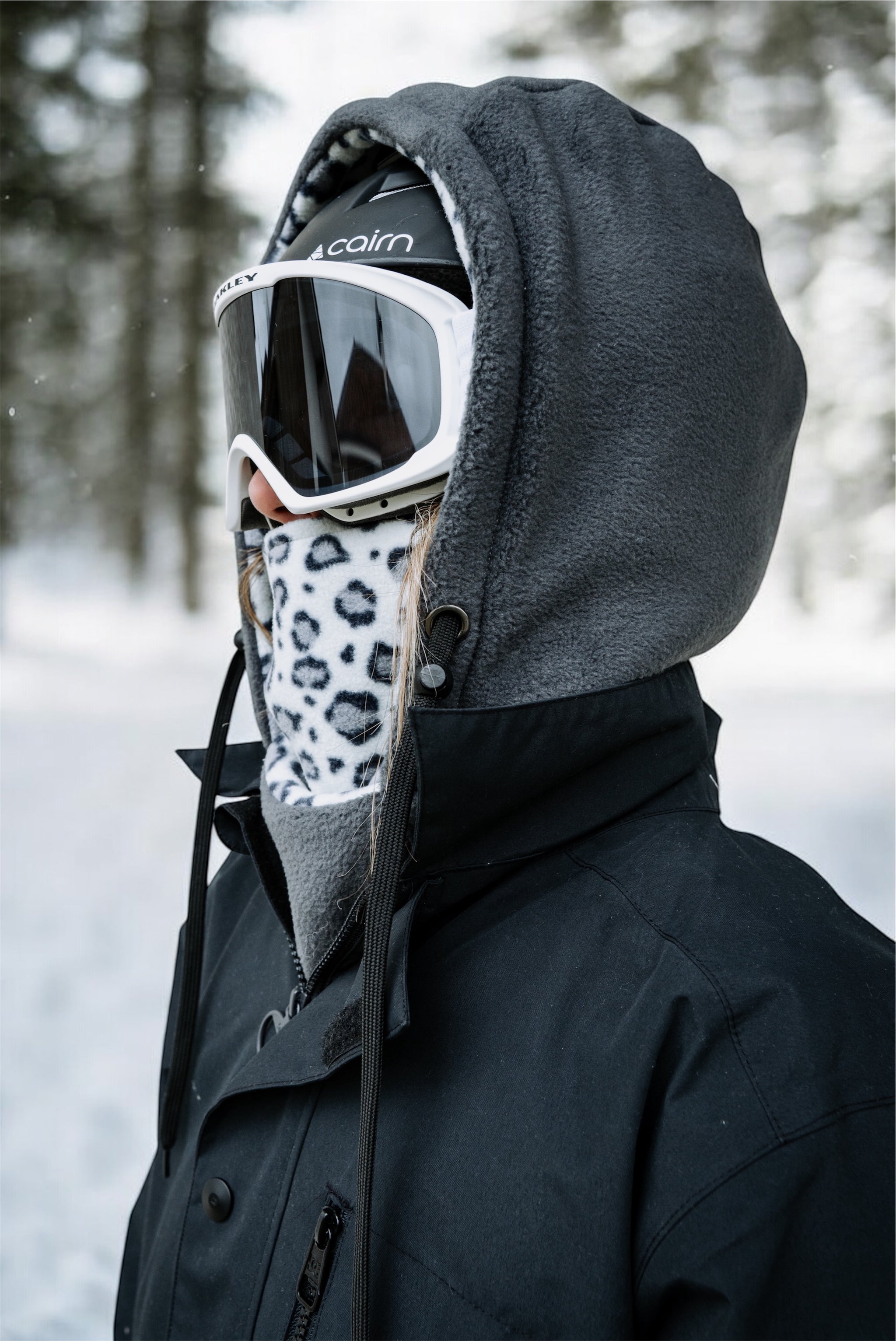 Cagoule en polaire noir épaisse et léopard à poils, parfaite pour les journées froides en montagne pour le snowboard, à skis ou en randonnée.